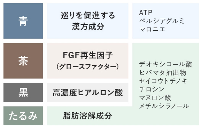 複数の有用成分(脂肪分解成分・ヒアルロン酸・FGF・漢方エキスなど)を目元に直接届けることで、クマの種類に応じたアプローチが可能とされています。