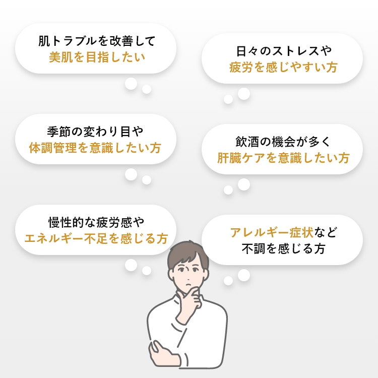 栄養補給・風邪予防・日常的な健康維持 | 抗酸化作用・美肌ケア・透明感サポート・免疫力維持・疲労回復・エイジングケアなど幅広い目的 |
