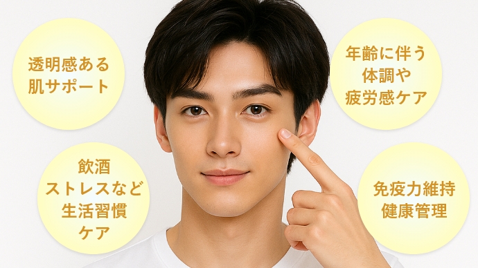 外回りや長時間デスクワークでの肌の乾燥・くすみケア、年齢に伴う体調や肌コンディションの変化へのサポート、さらには飲酒やストレスによる疲労感の軽減を意識する男性にもフィットするケアです。
