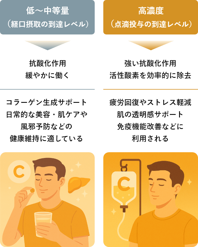 | 摂取方法 | 食事やサプリでビタミンCを摂取 | 静脈点滴で直接血管内に投与 |
